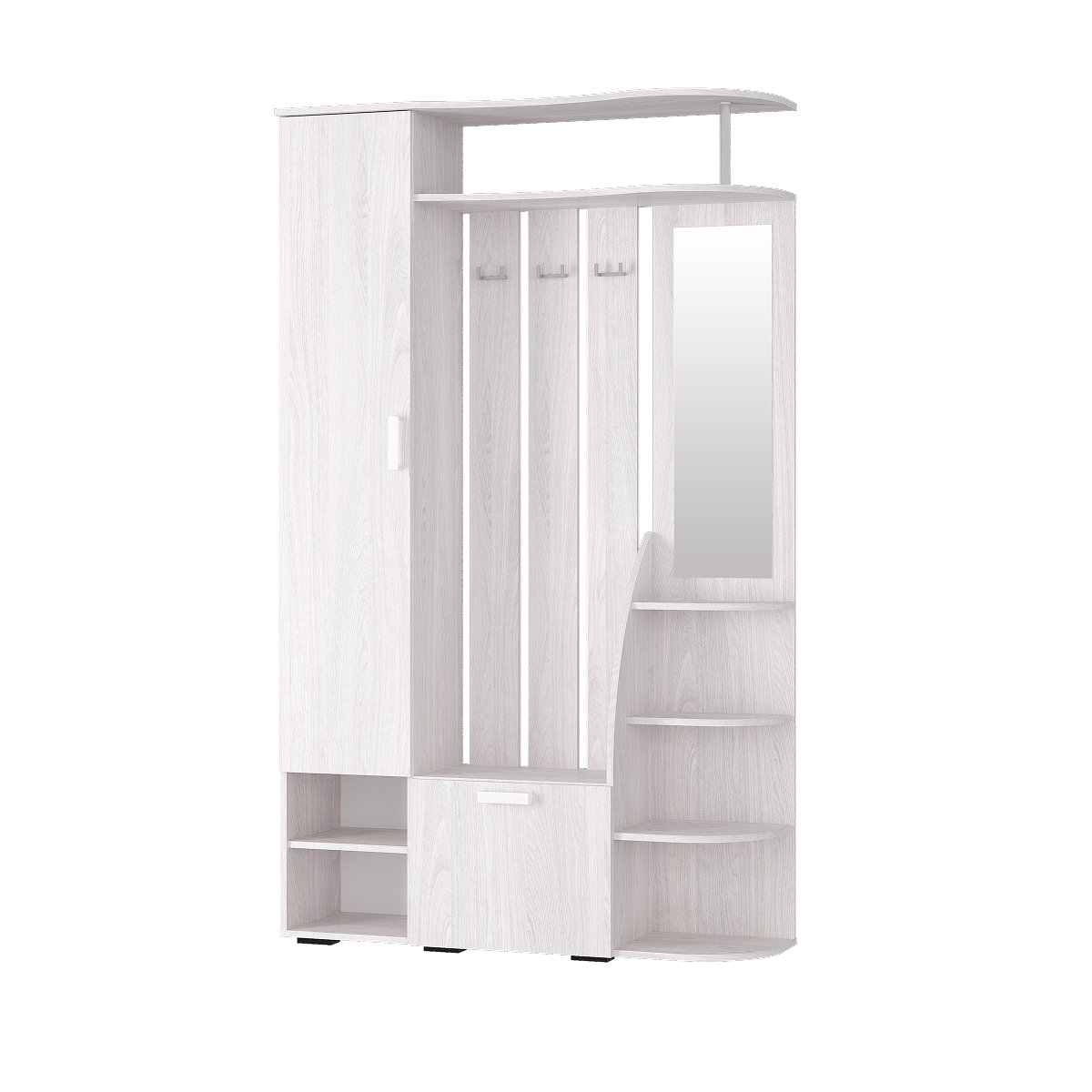 Прихожая «Анора» – это модель, выполненная в нежном оттенке «ясень белый». Лаконичный дизайн с мягкими линиями делает её идеальным решением для современного дома. Белоснежные ручки на дверцах легко ложатся в руку и облегчают ежедневное использование прихожей. В «Анора» предусмотрены все нужные зоны для хранения: боковые открытые полки для повседневной обуви, закрытый ящик для сезонной, а также полки для головных уборов и шкаф для верхней одежды.